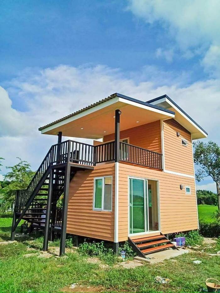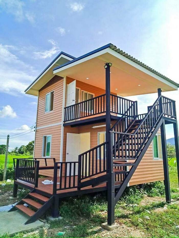 บ้านสองชั้นสไตล์โมเดิร์น โครงสร้างเหล็กน็อคดาวน์ ตกแต่งด้วยงานไม้ 2 ห้องนอน 2 ห้องน้ำ ในงบประมาณ 430,000 บาท (ไม่รวมเฟอร์นิเจอร์)