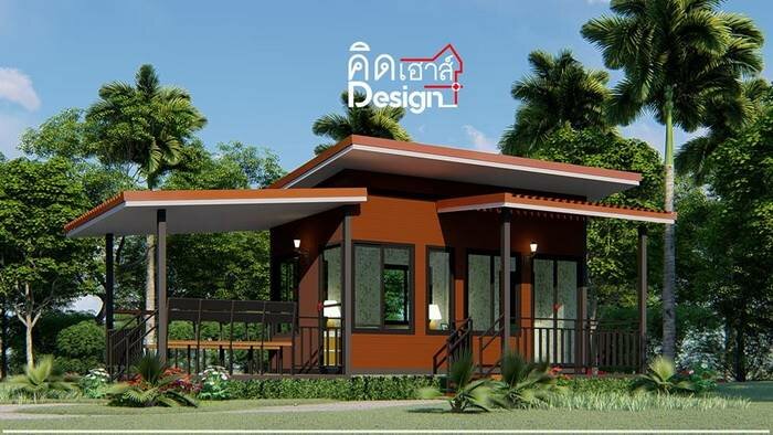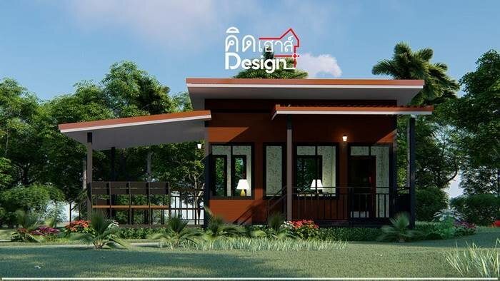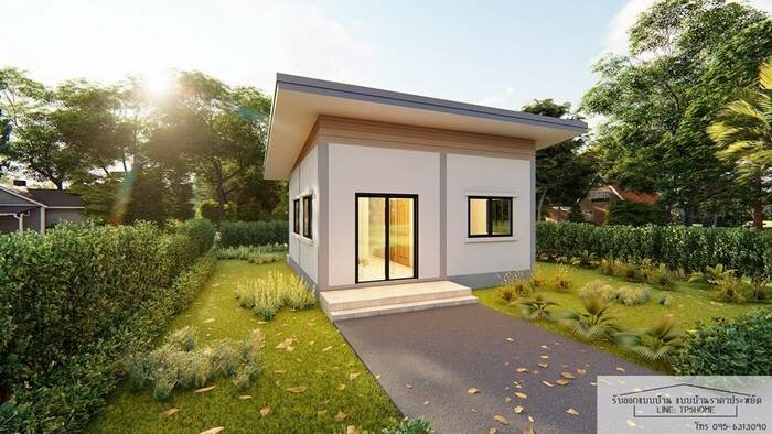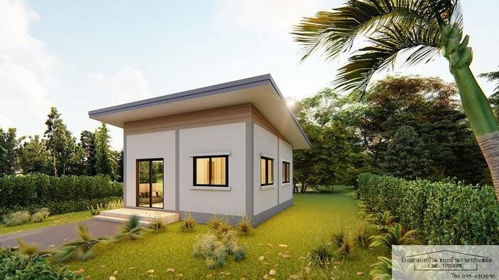 บ้านชั้นเดียวสไตล์โมเดิร์นทรอปิคอล ออกแบบเรียบง่าย พื้นที่ใช้สอย 42 ตร.ม. งบประมาณ 480,000 บาท 2 ห้องนอน 1 ห้องน้ำ พร้อมห้องโถง, ห้องครัว และเฉลียง