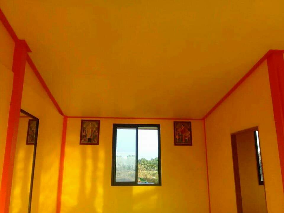 บ้านชั้นเดียวพร้อมร้านค้า โดดเด่นด้วยสีเหลืองสด 1 ห้องนอน 1 ห้องน้ำ ในงบก่อสร้าง 295,000 บาท (ไม่รวมที่ดิน)